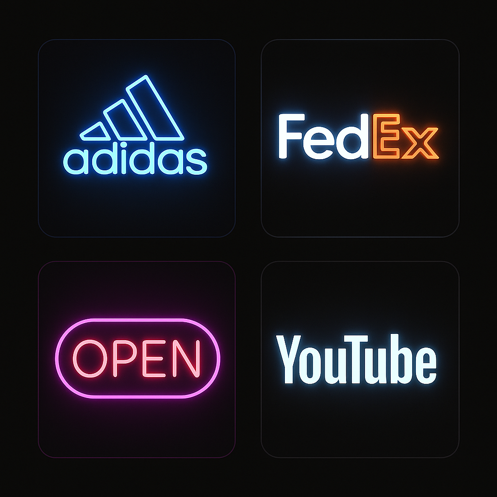 Neon logo design mimics glowing light effects, often used for nightlife, entertainment, or edgy, futuristic brand identities.